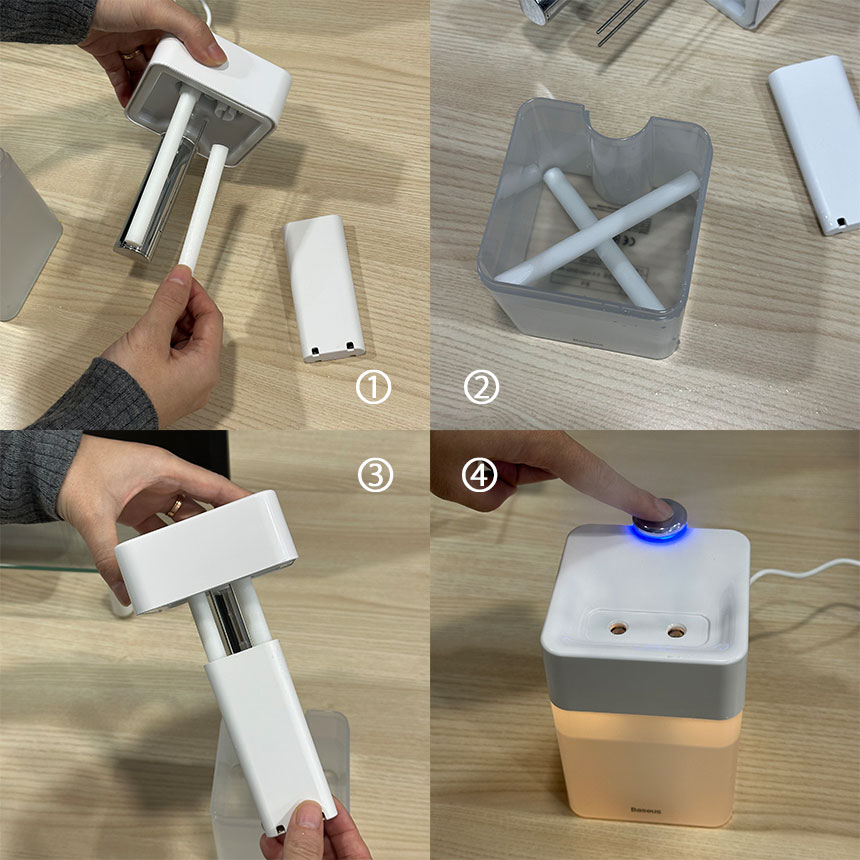 가습기안에 있는 심지를 빼내서 전체가 물에 잠기도록 2-3시간 이상 담궈주신 후 사용해주세요!